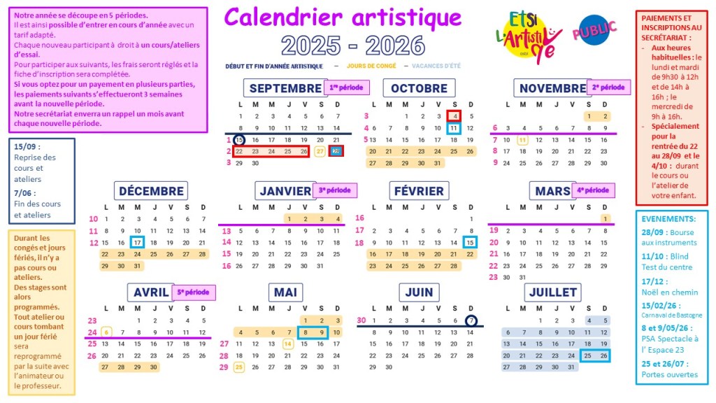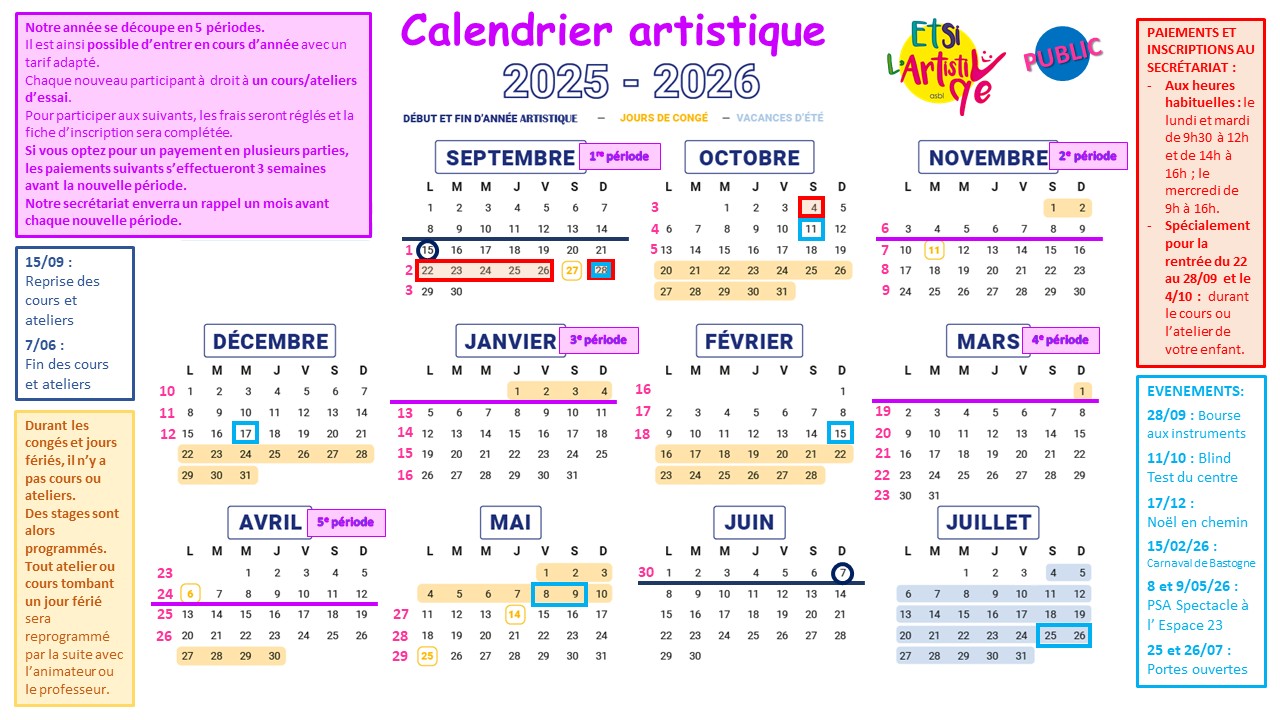 AGENDA Des stages artistiques sont programmés durant les congés scolaires (points jaunes). Plus d’informations : https://etsilartistique.com/stages-2024/ Partager : Cliquer pour partager sur X(ouvre dans une nouvelle fenêtre) X Cliquez pour partager sur Facebook(ouvre dans une nouvelle fenêtre) Facebook J’aime chargement…
